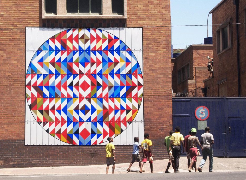 The idea of migration is central to street artist r1’s latest art intervention in New Doornfontein, Johannesburg titled Hidden Trophy – a 5x5m mandala installed on a street wall. The installation, situated at a t-junction, is made out of 100 reflective chevron street signs that come together in a colourful design that illuminates at night as cars drive by. If you look a little closer you’ll note the subliminal outline of a blue wildebeest head, a metaphoric ode to migration.
