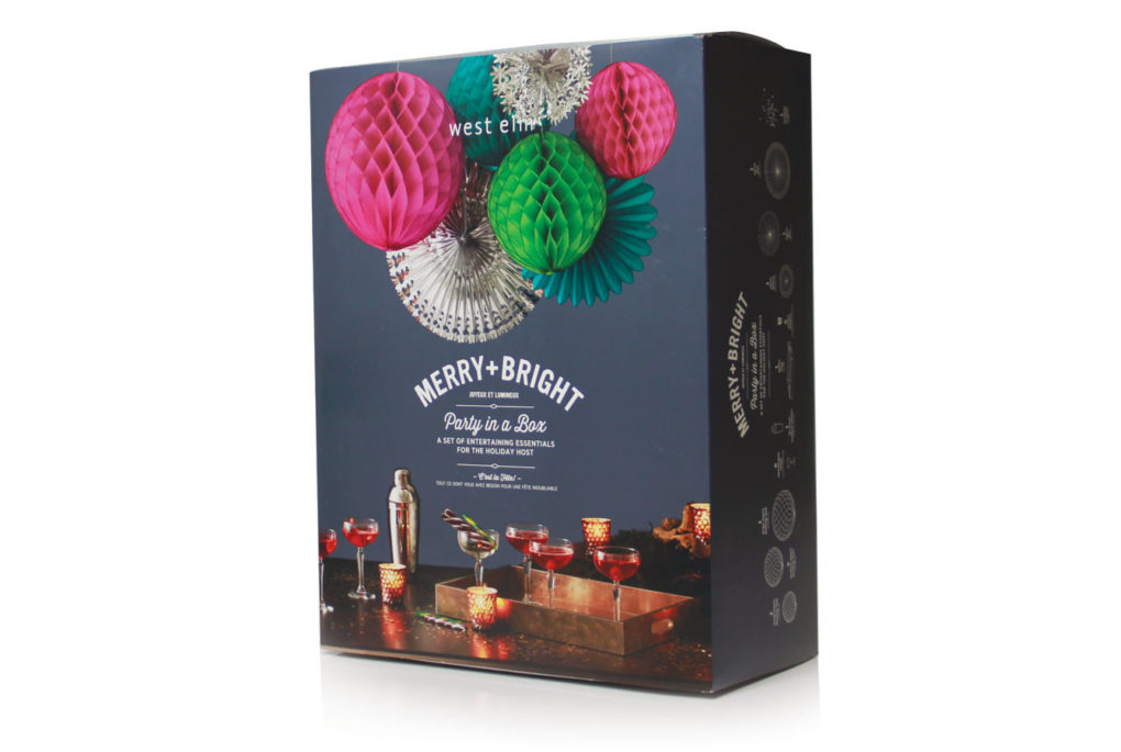 With rounds of rapid prototyping and user testing, structural packaging design evolved to both protect and utilize the products themselves for support, without the need for glues. An interchangeable outer sleeve was developed to gain economies of scale on the complex packaging structures, and simplify updating the box exterior as needed. With structural design‚ material selection‚ and an intuitive unveiling process in place‚ the West Elm team supplied visual design and we were ready to party in our box.