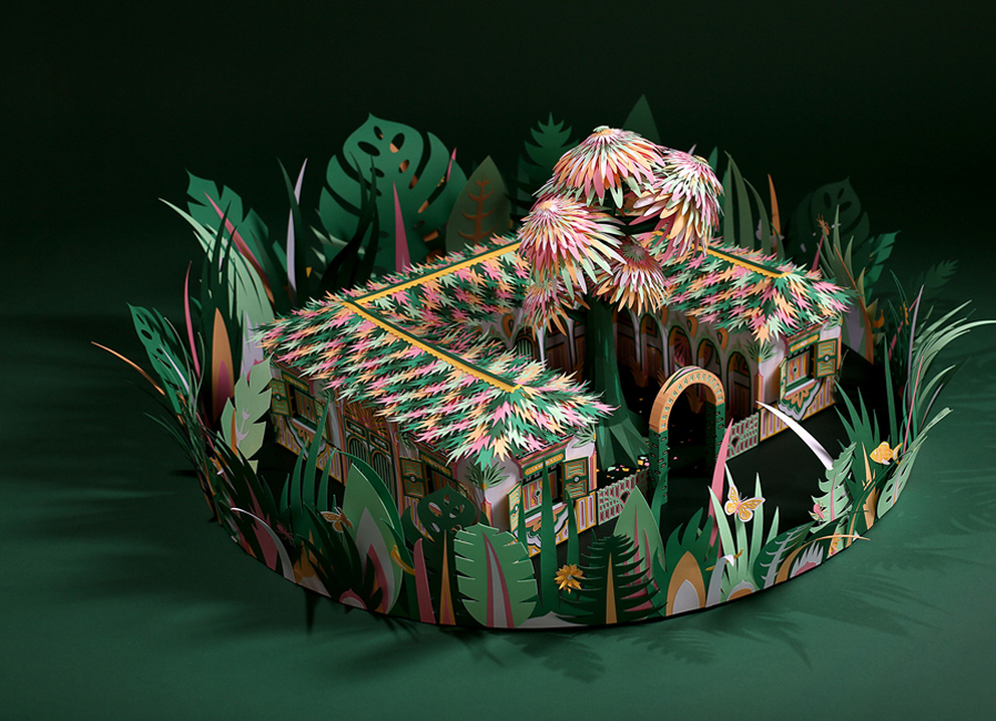 the second paper story came from zim & zou’s nobel muse, gabriel garcía márquez and his magical realism story, ‘one hundred years of solitude.’ the yellow and green scene constructed by zim & zou might capture a part of mocando — a fictional town in colombia, founded by marquez’ patriarchal character and described in prose over the course of multiple generations.